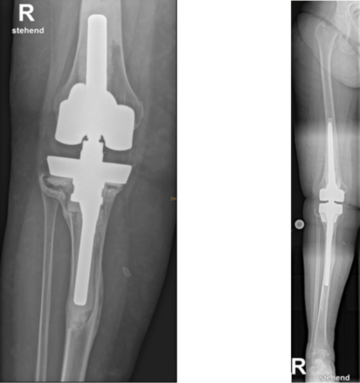 Gelockerte Knieprothese vor und nach Wechsel auf eine gekoppelte Knieprothese